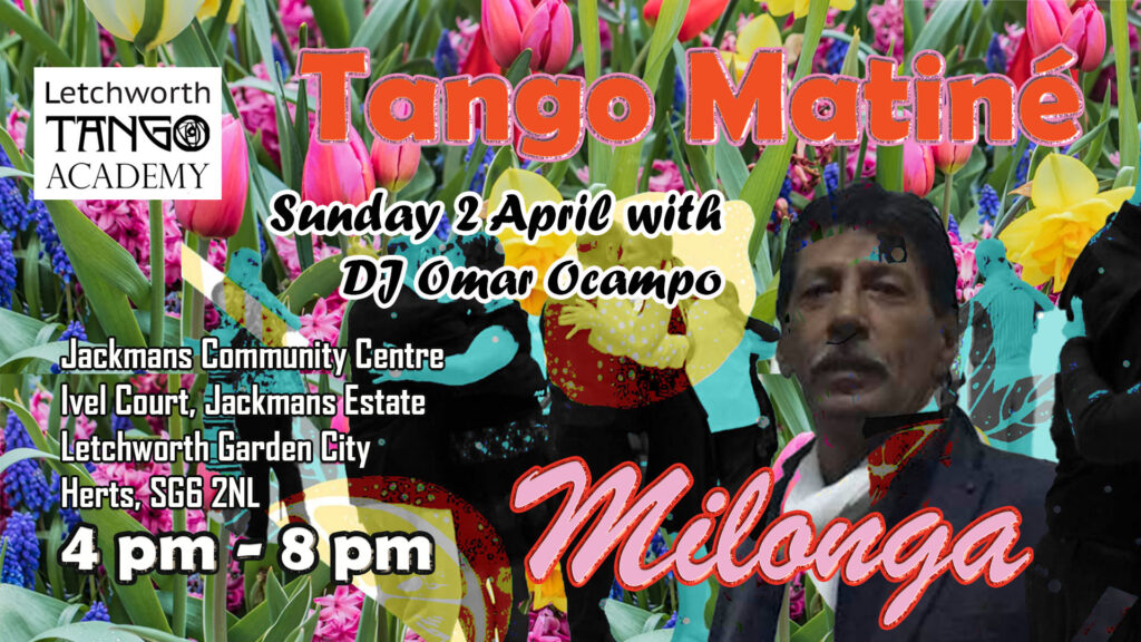 Tango Matiné with DJ Omar Ocampo on Sunday the 2nd of April! In Letchworth from 4pm until 8pm – no need to book, £12 at the door. Lovely dancers and a variety of yummy sandwiches and cakes! Tea, coffee and cakes provided. Soft drinks and alcoholic drinks available from the bar in the venue. Free parking at the venue`s car park