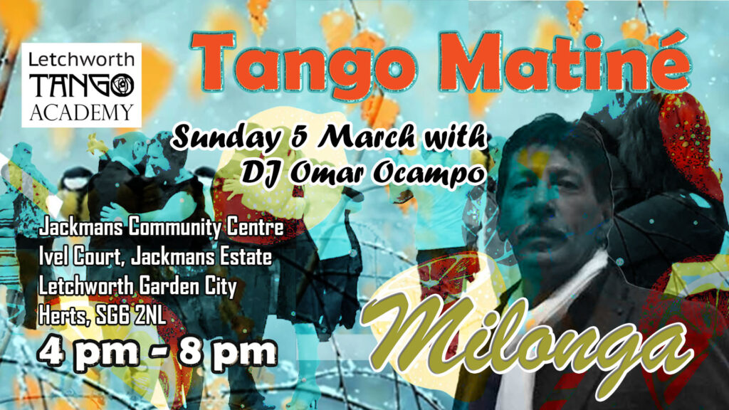 Tango Matiné with DJ Omar Ocampo on Sunday the 5th and 19th of March! In Letchworth from 4pm until 8pm – no need to book, £12 at the door. Lovely dancers and a variety of yummy sandwiches and cakes! Tea, coffee and cakes provided. Soft drinks and alcoholic drinks available from the bar in the venue. Free parking at the venue`s car park